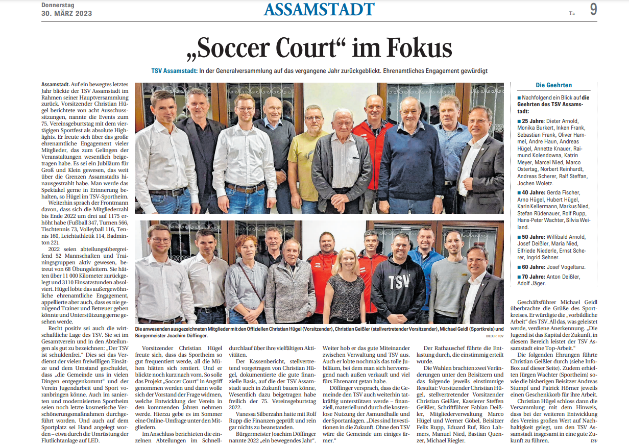 Am 25. März 2023 fand die diesjährige Generalversammlung vom TSV Assamstadt statt. Gemeinsam wurde auf das vergangene Jahr zurückgeblickt. Näheres findet ihr auch hier.
