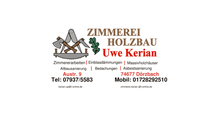Adresse: Austraße 9, 74677 DörzbachTelefon: 07937/5583E-Mail: zimmerei-keian@t-online.de
